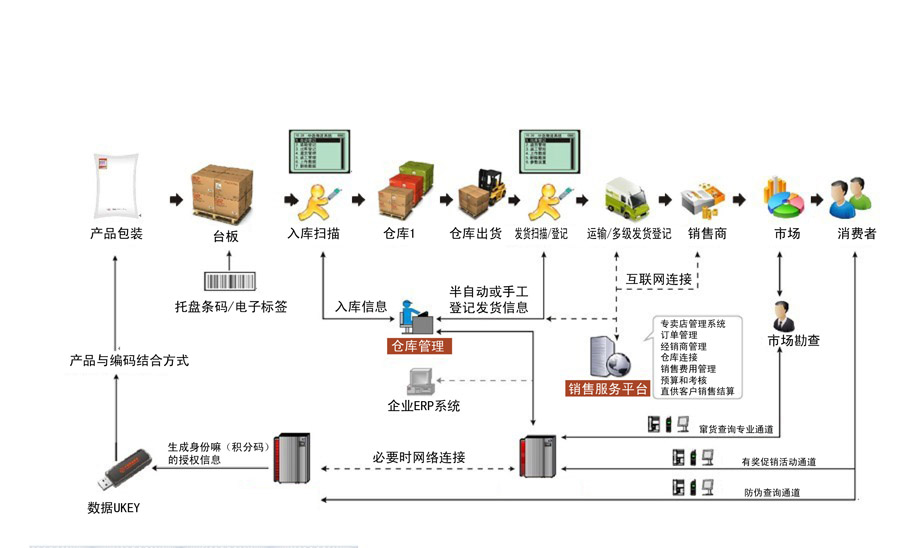 倉儲環(huán)節(jié):從生產(chǎn)(貼)到入庫(可選擇兩套系統(tǒng),掃描入倉和直接不掃描入倉。)直至市場查詢(消費者、稽查人員等)等流通環(huán)節(jié)查詢等功能上,善進產(chǎn)品防偽防竄解決方案都具有無法比擬的完整性和靈活性。除此之外,產(chǎn)品防偽防竄解決方案所具備的保證安全性的加密功能,功能的可擴性以及高效的運作成本,都顯示出無比的優(yōu)越性。善進“數(shù)字化流向監(jiān)管系統(tǒng)”集成解決方案強大的防偽防竄全方位跟蹤追溯效果,穩(wěn)定的產(chǎn)品性能,專業(yè)的售后服務(wù),正在幫助更多的企業(yè)實現(xiàn)完善的產(chǎn)品跟蹤防偽、防竄貨管理。
