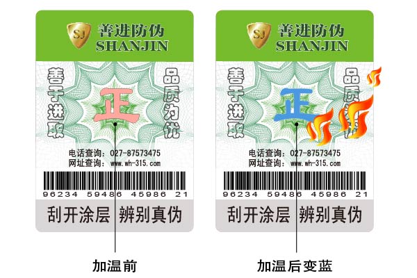 在防偽檢測(cè)方面最為簡(jiǎn)單、最易操作的納米級(jí)材料防偽;鑒別時(shí)只需標(biāo)識(shí)上溫度達(dá)到(如:打火機(jī)考圖案部位),圖案即消失或變色,溫度恢復(fù)后,圖案自然恢復(fù),具有可逆性,是國(guó)內(nèi)先進(jìn)的防偽技術(shù)。